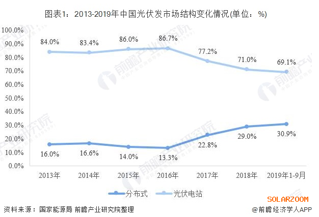 不同于光伏電站,分布式光伏發(fā)電是指在用戶(hù)所在場(chǎng)地或附近建設(shè)運(yùn)行,以用戶(hù)側(cè)自發(fā)自用為主、多余電量上網(wǎng)且在配電網(wǎng)系統(tǒng)平衡調(diào)節(jié)為特征的光伏發(fā)電設(shè)施。近年來(lái),國(guó)家對(duì)分布式光伏發(fā)電系統(tǒng)一直采取積極鼓勵(lì)的態(tài)度,并出臺(tái)了一系列扶持措施。2016年底出臺(tái)的《電力發(fā)展“十三五”規(guī)劃》對(duì)分布式光伏設(shè)定了超常規(guī)發(fā)展目標(biāo):“2020年,太陽(yáng)能發(fā)電裝機(jī)達(dá)到1.1億千瓦以上,分布式光伏6000萬(wàn)千瓦以上”。隨著各地分布式光伏發(fā)電建設(shè)的推進(jìn)。我國(guó)光伏發(fā)電市場(chǎng)結(jié)構(gòu)發(fā)生改變,尤其是2016年以來(lái),我國(guó)分布式光伏市場(chǎng)份額已經(jīng)由13.3%提升至30.9%。