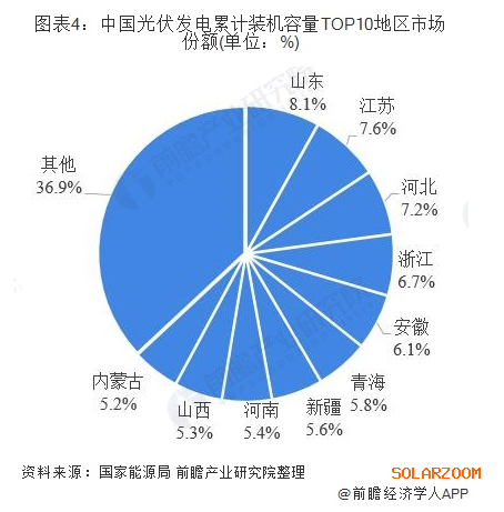 累計(jì)裝機(jī)容量方面,截至2019年第三季度,我國(guó)共有9個(gè)地區(qū)光伏發(fā)電累計(jì)裝機(jī)容量超過(guò)1000萬(wàn)千瓦。其中山東以1541萬(wàn)千瓦,排名第一,占全國(guó)總裝機(jī)容量的8.1%;江蘇和河北緊隨其后,分別以1445萬(wàn)千瓦和1363瓦千瓦占全國(guó)總裝機(jī)容量的73.6%及7.2%。
